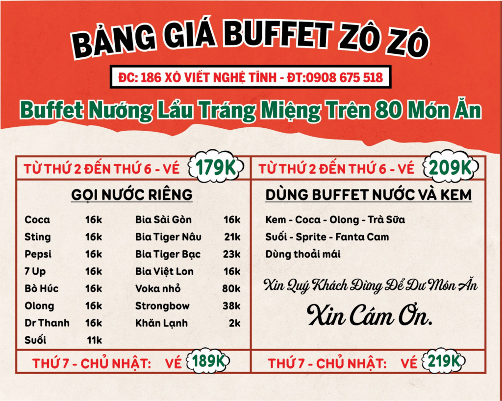 Một điểm cộng lớn khiến ai cũng hài lòng là tất cả các mức giá vé đều đã bao gồm nước uống và quầy tráng miệng. Đặc biệt, nhà hàng còn cực kỳ hào phóng khi không giới hạn thời gian ăn uống và bán xuyên Tết, giúp bạn và người thân có thể tận hưởng bữa tiệc một cách thảnh thơi và trọn vẹn nhất.