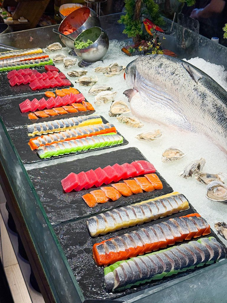 Về ẩm thực, quán mang đến hơn 120 món ăn đa dạng. Thực khách có thể lựa chọn từ quầy sushi, sashimi tươi ngon cho đến trải nghiệm tự tay bắt hải sản sống tại hồ để chế biến ngay tại chỗ. Với vé VIP, thực khách sẽ được tận hưởng thêm quầy dimsum hấp dẫn, phần bò tuyết cao cấp, cùng tủ kem miễn phí phục vụ trọn gói.