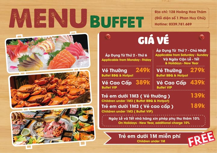 Không chỉ vậy, quán còn có quầy chế biến bánh xèo, bánh khọt trực tiếp, đem lại hương vị nóng hổi và sự thú vị trong cách thưởng thức. Khu vui chơi riêng cho trẻ em cũng là điểm cộng lớn, giúp các gia đình có con nhỏ yên tâm khi ghé ăn. Đặc biệt, vào buổi sáng và trưa, quán còn phục vụ thêm nhiều món từ nước đến khô với mức giá chỉ từ 65 xu, mang lại nhiều lựa chọn phong phú cho thực khách.Tọa lạc gần Quảng Trường Cột Cờ, quán không chỉ thuận tiện cho việc di chuyển mà còn là điểm dừng chân lý tưởng để vừa thưởng thức buffet, vừa tận hưởng không gian thoáng đãng bên hồ.