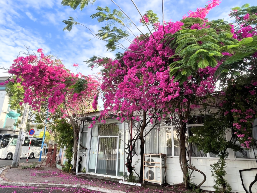 - Vibe lãng mạn như phim: Góc tường sơn trắng muốt làm nền cho dàn hoa giấy màu hồng rực rỡ bung nở phủ kín không gian. Đặc biệt, những cánh hoa rụng lả tả trên vỉa hè tạo thành một tấm thảm hồng cực kỳ thơ mộng.